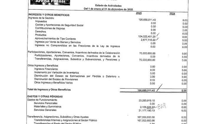 El estado de actividades de la Arena Potosí muestra que el año pasado generó ingresos propios por 126.6 millones de pesos, de los cuales 124 millones correspondieron a aprovechamientos de tipo corriente y 2.6 millones de pesos por venta de bienes y servicios.