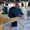 De lado poniente de la vía guadalupana, los trabajadores instalan las piedras labradas sobre la base de concreto creada para dar estabilidad a los adoquines. Los espacios entre un cuadro de cantera y otro se rellenan con cemento.