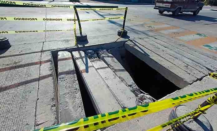 El hundimiento es una caja de válvulas ubicada en el tramo intermedio de la nueva ampliación de la avenida, entre el fraccionamiento El Aguaje 2000 y el crucero del tramo carretero.