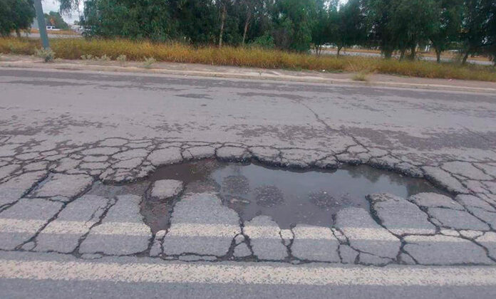 El pavimento lateral del Bulevar San Luis ya no sirve, a casi dos décadas de la construcción de los puentes vehiculares en la Zona Industrial, el mantenimiento es casi nulo, y los golpes de las llantas de los camiones y autobuses de transporte de personal van destrozando el asfalto, hasta acabar con él.