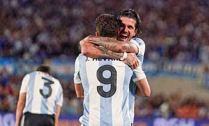 El artillero Julián Álvarez abrió el marcador, Enzo Fernández aumentó y luego asistió a Alexis Mac Allister para el tercero, mientras que Giuliano Simeone cerró la goleada en el estadio Monumental de Buenos Aires ante 85,000 espectadores.