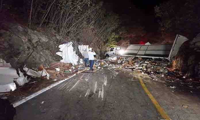 EL NARANJO.- Un camión que transportaba abarrotes chocó contra un cerro y volcó sobre la carretera federal número 80.