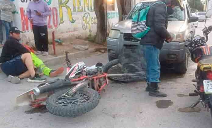 Matehuala.- Una persona lesionada deja el choque de dos motociclistas, además de daños materiales, percance que se generó en el cruce de las calles Leona Vicario y Libertad, el lesionado recibió auxilio de elementos de corporaciones de emergencia.
