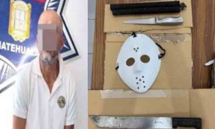 Matehuala.- Policías municipales detienen a un hombre que con una máscara del personaje de las películas de terror Jason Vorhess y un machete y cuchillo amenazaba a las personas en la colonia San Isidro.