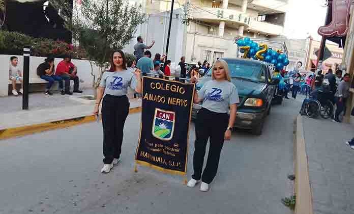 Matehuala.- El Colegio Amado Nervo de Matehuala celebró su 72 aniversario y para conmemorar esta importante fecha, llevó a cabo un colorido desfile por las calles de la ciudad presentando a sus candidatas a reina y a rey, además de realizar una callejoneada.