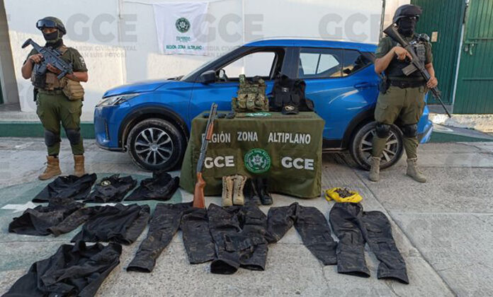 Tras asegurarse el perímetro, se inspeccionó a la camioneta, encontrándose en su interior una escopeta calibre 12 milímetros; cinco cargadores; una cinta de eslabón desintegrable para ametralladoras automáticas; 122 cartuchos útiles; dos chalecos tácticos; cuatro placas balísticas; 67 objetos de varilla y seis uniformes tácticos con insignias de una posible red delincuencial.