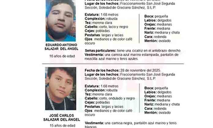 La Fiscalía General del Estado activó una ficha de Alerta Ámber para la localización de los hermanos Eduardo Antonio Salazar Del Ángel y José Carlos Salazar Del Ángel, de 16 y 15 años de edad, respectivamente, quienes fueron vistos por última vez el 28 de noviembre de 2025 en el fraccionamiento San José Segunda Sección.