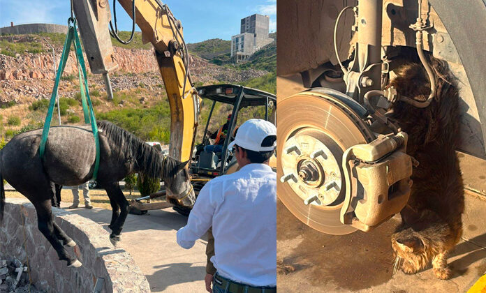 Un caballo y un gatito fueron rescatados por socorristas luego de que en distintos casos su vida corriera peligro al quedar atrapados, el primero en el desnivel de una glorieta y el segundo en la llanta de un carro.