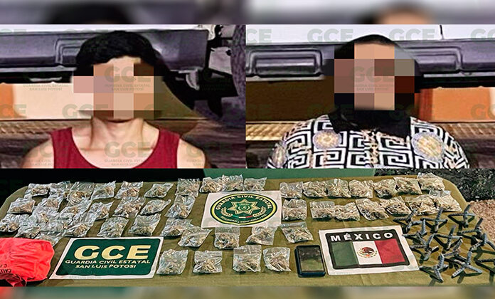A los presuntos, Miguel “N” de 21 años y Jesús “N” de 26 años, se les aseguraron 48 bolsas de marihuana 12 artefactos metálicos en forma de estrella denominados “poncha llantas” y un vehículo Ford Escape color blanco modelo 2012 sin placas.