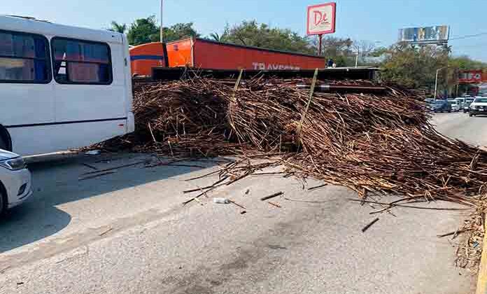 CIUDAD VALLES.- Un camión cargado con varias toneladas de caña tuvo una falla en los frenos en la declive del fraccionamiento Valle Alto, y terminó volcando en la intersección de los bulevares.