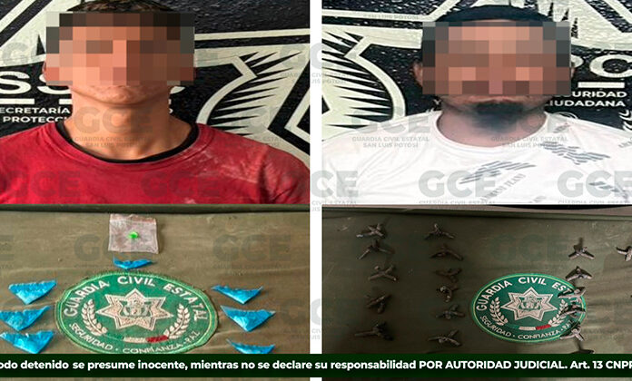 Dos posibles integrantes de grupos delictivos fueron capturados por elementos de la Guardia Civil Estatal con droga y ponchallantas, siendo detectados cuando deambulaban en el municipio de Matehuala.