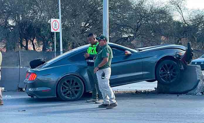 Un automóvil Mustang presentó fuertes daños materiales luego de chocar contra el muro de contención y un poste de alumbrado en el Anillo Periférico Norte, por suerte no hubo personas lesionadas en este caso.