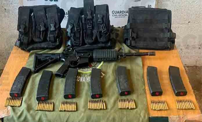 Al notar la presencia de las unidades policiales, los individuos se dieron a la fuga internándose en una zona despoblada, dejando abandonado un arma de fuego tipo fusil de asalto calibre 5.56, además de siete cargadores, 70 cartuchos útiles y tres chalecos tácticos, lo que encendió las alertas por la peligrosidad del equipo localizado.