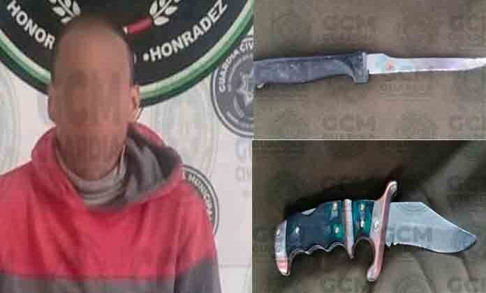 Posteriormente, en avenida Zaragoza, a la altura de la colonia Quintas de la Hacienda, fue detectado un sujeto que alteraba el orden; luego de que oficiales municipales se acercaron a entrevistarlo y señalarle la falta que cometía, dijo llamarse Héctor “N” de 31 años, localizándole un utensilio con hoja metálica afilada semejante a un cuchillo.