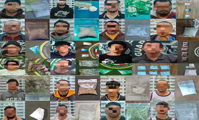 Como resultado del operativo “Cazador”, entre oficiales de la GCE y policía capitalina, se detuvo a Moisés “N” de 27 años de edad, en la colonia Tercera Grande, con una dosis de “cristal”; dispositivos de seguridad, en el fraccionamiento Urbi Villas del Real, derivaron en la detención de Juan “N” de 29 años, ubicado con una dosis de “cristal”; José “N” de 26 años, quedó detenido en la colonia Popular, con una dosis de “cristal”; también se detuvo a Jorge “N” de 38 años, con una dosis de “cristal”, en la colonia Constituyentes.
