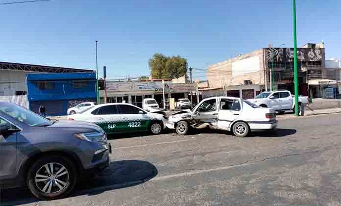 Un taxi y un automóvil particular chocaron contre sí al circular por la carretera a Rioverde, a la altura del Tecnológico Regional; los daños son considerables, pero por suerte no se reportaron lesionados en este caso.