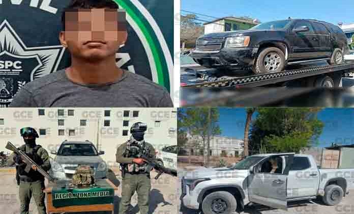 Al continuar con los dispositivos, los agentes estatales aseguraron una camioneta Chevrolet Tahoe color negro, modelo 2011, de procedencia extranjera, con reporte de robo en la ciudad de Reynosa, Tamaulipas y recuperada en la colonia Valle Alto, del municipio de Ciudad Valles, deteniéndose en el sitio a Emilio “N” de 24 años de edad.