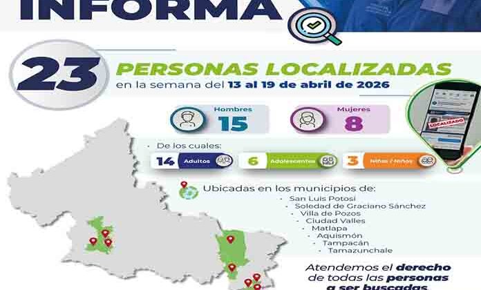 Del total de personas ubicadas, 15 corresponden a masculinos y 8 a femeninas; de ellas, se clasifican en 11 hombres, 3 mujeres, 6 adolescentes y 3 infantes, con un rango de edad que va de los 3 a los 73 años. Estas localizaciones se efectuaron durante la última semana en distintos municipios.