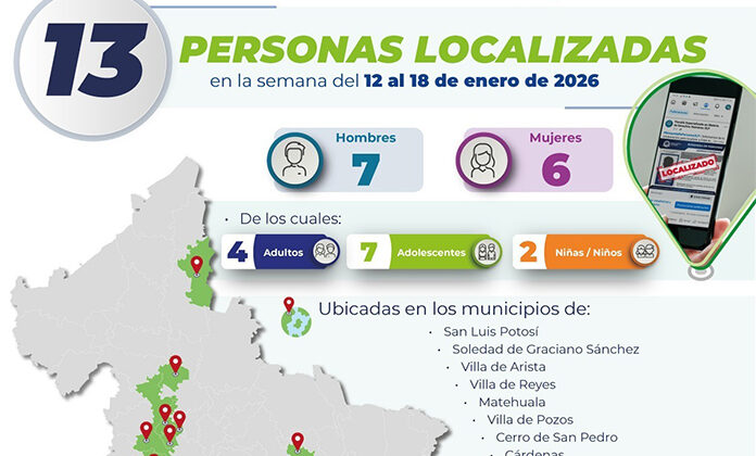 Las personas fueron localizadas en distintos municipios del estado, entre los que se encuentran San Luis Potosí, Soledad de Graciano Sánchez, Villa de Pozos, Villa de Arista, Villa de Reyes, Matehuala, Cerro de San Pedro y Cárdenas.