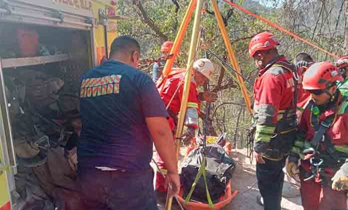 Luego de diversas maniobras, en las que se utilizaron cuerdas y una polea, los socorristas pudieron rescatar el cuerpo del infortunado, el cual pusieron en una camilla para subirlo hacia el camino.