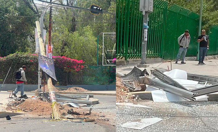 Cuando llegó a la avenida Paseo de los Derechos Humanos, el conductor perdió el control del volante y de esta forma chocó de frente contra un poste de madera de Telmex, al cual derribó desde la base y al continuar con su trayectoria errática se estampó contra el anunció de cristal, al cual también hizo añicos.