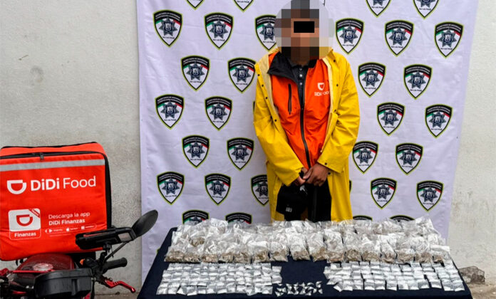 Un presunto distribuidor de droga que traía cientos de dosis, quien se hacía pasar como repartidor de comida, fue detenido por elementos de la Guardia Municipal de la capital que lo detectaron en la colonia Molinos del Rey, al norte de la ciudad.