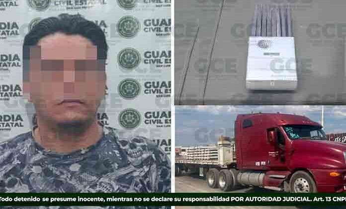 Los hechos tuvieron lugar en la colonia Las Mercedes, donde Juan “N” de 33 años fue detenido tras no poder comprobar ser dueño o tener la posesión legal del tractocamión color rojo, acoplado a una plataforma color blanco, ambas con reporte de robo de la zona Industrial. Cabe señalar que, también se aseguró un inhibidor de señal, con 16 antenas.