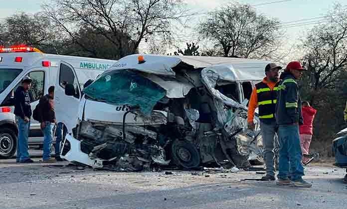 Una camioneta de transporte de personal, protagonizó un aparatoso accidente la mañana de este martes cuando circulaba por la carretera ‘37 a Villa de Reyes, en donde chocó contra un tráiler; el saldo es del conductor muerto y nueve pasajeros lesionados, al menos tres de gravedad.