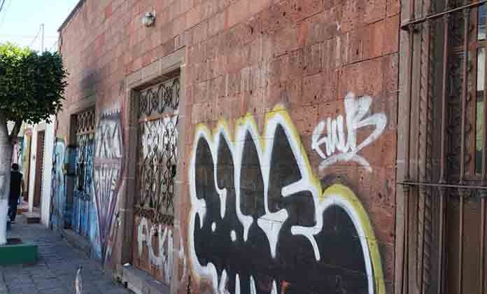 Un ejemplo es un inmueble que se encuentra a pocos metros del cruce de la calle Miguel Hidalgo y Mariano Matamoros, cuyos muros y portones de acceso se hallan totalmente “decorados” de grafitis de color azul, amarillo, negro, rojo y plata que seguramente fueron realizados en altas horas de la madrugada cuando la vigilancia policial es menor en las calles más céntricas de la cabecera municipal.