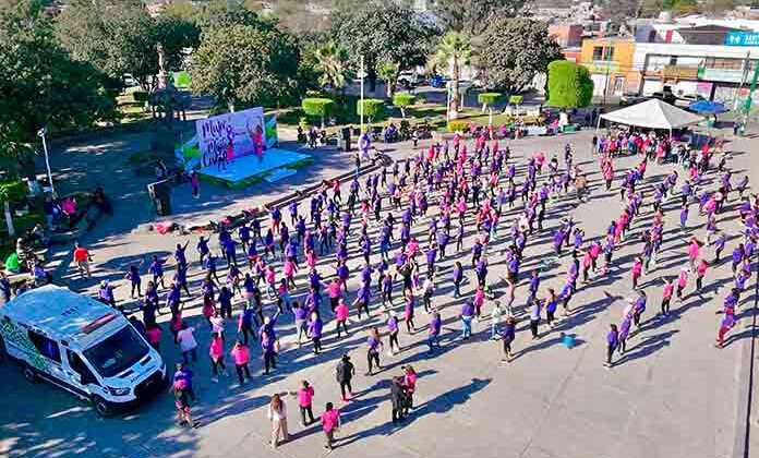 La instancia de la mujer organizó, como parte de las actividades del 8M, una clase masiva de activación física en la plaza principal de Soledad de Graciano Sánchez, en la que participaron mujeres de todas las edades.
