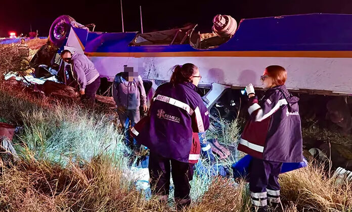 Zacatecas, Zac.- Las autoridades de Zacatecas han confirmado que suman cinco jornaleros muertos y 15 heridos, tras el accidente de un autobús procedente de Durango que se dirigía al municipio de Fresnillo, pero volcó sobre la carretera federal 49, cerca del entronque que conduce al municipio de Cañitas de Felipe Pescador.
