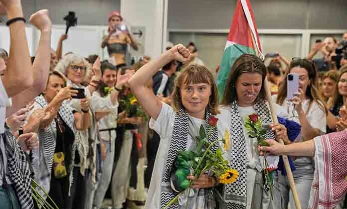 La activista sueca fue una de las docenas de deportados que aterrizaron en Atenas el lunes por la tarde. Multitudes de simpatizantes se reunieron en el Aeropuerto Internacional Eleftherios Venizelos y corearon “¡Liberen, liberen a Palestina!” Mientras los activistas desembarcaban.