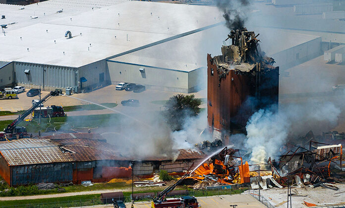 La planta produce lechos para animales y plataformas para calefacción y ahumado de alimentos, utilizando toneladas de desechos de madera. Spellerberg señaló que las autoridades creen que la explosión se originó de polvo de madera en la torre del elevador.
