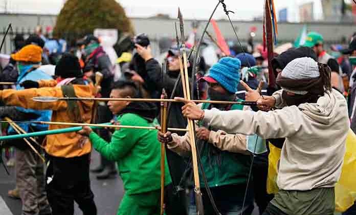 Bogotá, Col.- Cuatro policías colombianos resultaron heridos este viernes luego de ser atacados con flechas por un grupo de indígenas que protesta frente a la Embajada de Estados Unidos en Bogotá contra la política de ese país hacia Gaza, Venezuela y Ecuador.