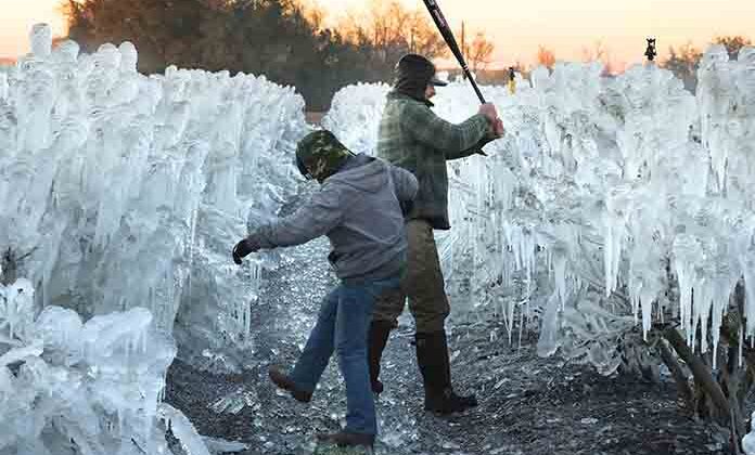 El frío también cubrió de hielo las fresas y naranjas en el estado. Los agricultores de Florida suelen rociar agua sobre los árboles frutales y plantas de bayas para protegerlas del frío.