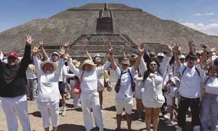 Al lado de ellos caminaban turistas extranjeros y nacionales, la mayoría vestidos de blanco, algunos en su totalidad, otros solo usando una prenda de ese color y entre esa multitud que se tomaba fotos familiares, selfies en pareja y que elevaban sus manos hacia el cielo con las palmas abiertas, estuvo Yadira Ortiz, originaria de Oaxaca, quien visitó por primera vez la zona arqueológica.