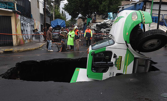 De acuerdo con videos compartidos por la propia demarcación, se puede observar que en un principio, el camión quedó atrapado del eje trasero. En ese momento la zona del socavón ya había sido delimitado por elementos de PC y policías capitalinos.