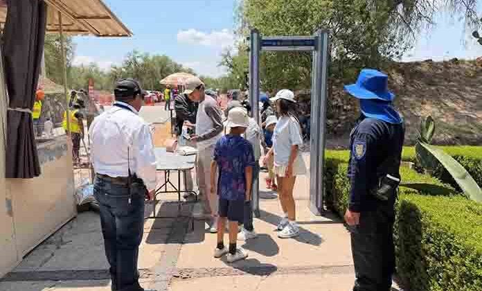 Teotihuacán, Méx.- Autoridades de la Zona Arqueológica de Teotihuacán implementaron este domingo un nuevo dispositivo de seguridad con la instalación de cinco arcos detectores de metales, uno en cada acceso, luego de que Julio César realizara disparos desde la Pirámide de la Luna el pasado 20 de abril, y mató a una turista canadiense e hirió a 13 más y él, luego, se suicidó.