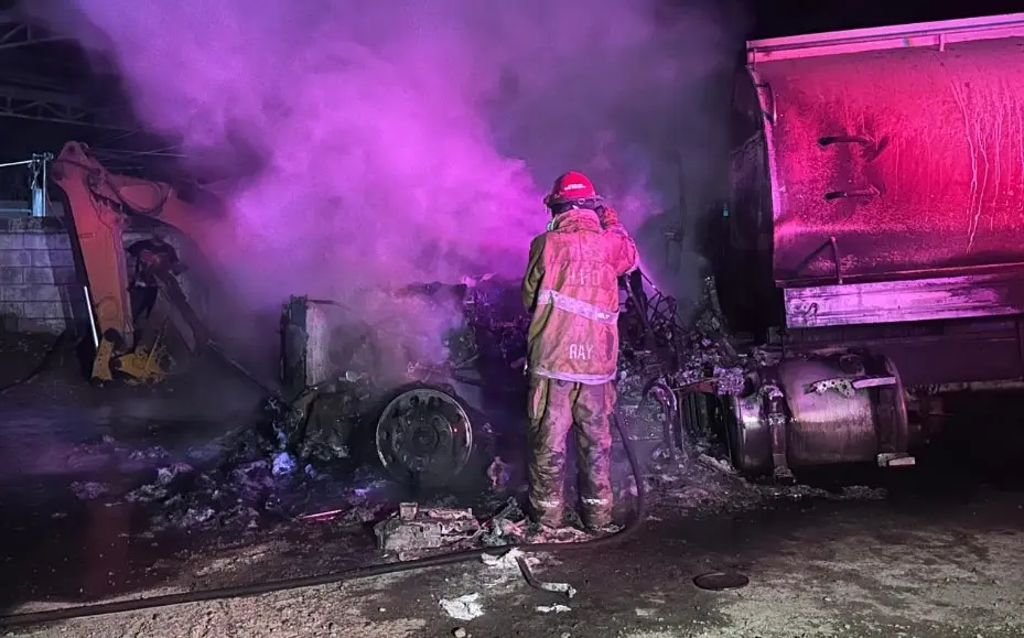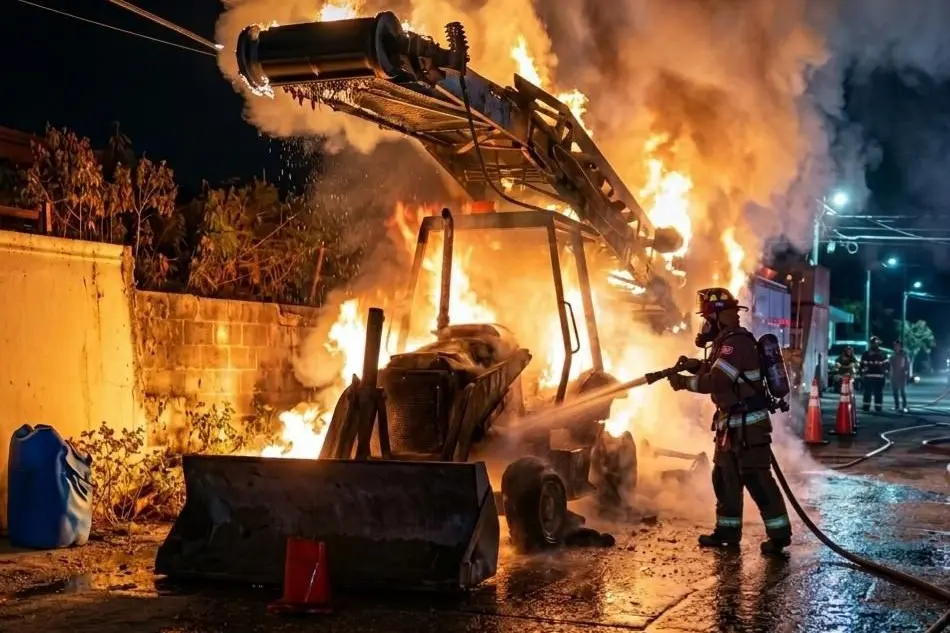 Fuego consume maquinaria de obra en avenida de Tamuín